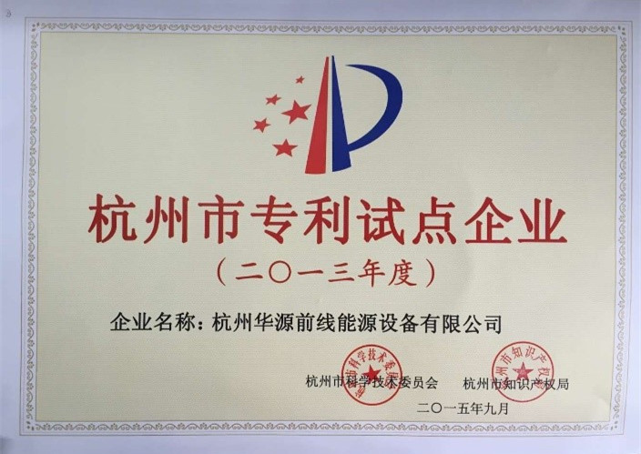 2014年,依據杭州市知識產權局下發的《關于開展杭州市專利試點(示范)企業申報和考核工作的通知》(杭科知〔2014〕231號),共評出200余家企業為杭州市專利試點企業,華源前線榜上有名,這是對我公司研發成果的最好肯定,也是對我公司未來研發潛力的認可。