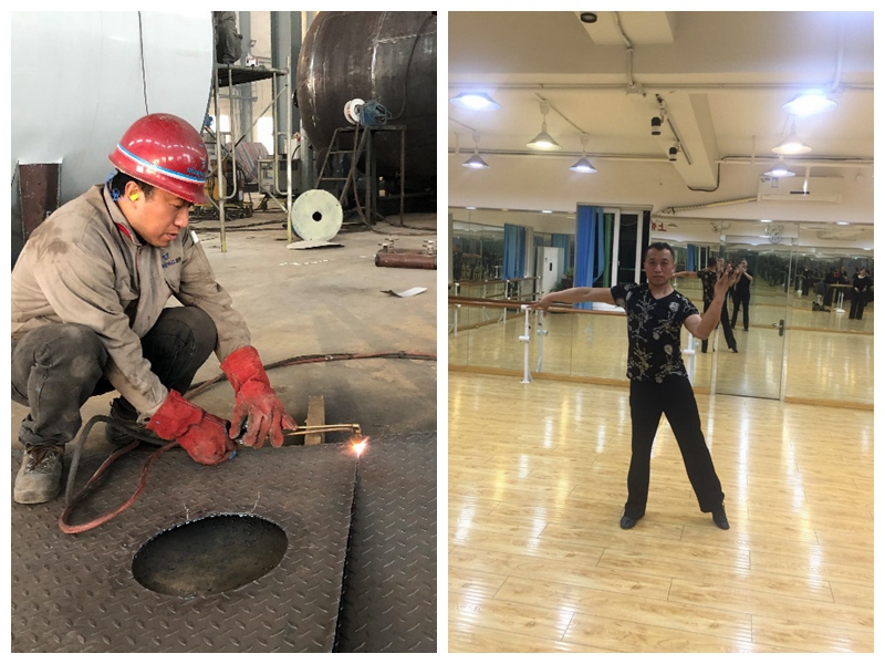穿上工作服,他細(xì)心專注在火花閃耀的車(chē)間,腦海里只有圖紙、焊接要領(lǐng);換上舞衣,他是熱情洋溢、光芒四射的舞者,耳中聽(tīng)著的只有音樂(lè)、節(jié)拍。