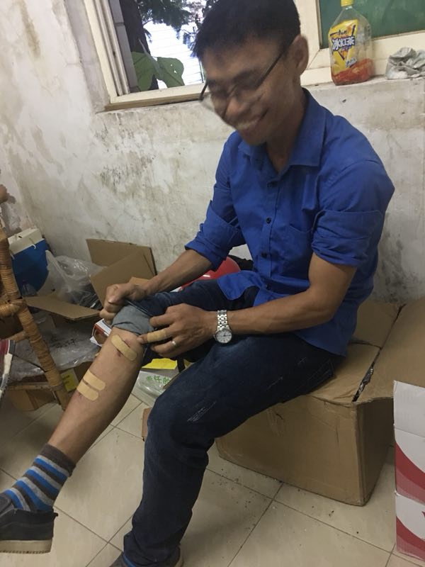 (溫先文經理貼上創口貼,那笑容好像做好足底按摩了,繼續上工地)