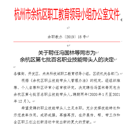 近日,公司傳來喜訊,生產(chǎn)部焊接一組王永同志榮獲余杭區(qū)第七批百名“職業(yè)技能帶頭人”稱號。