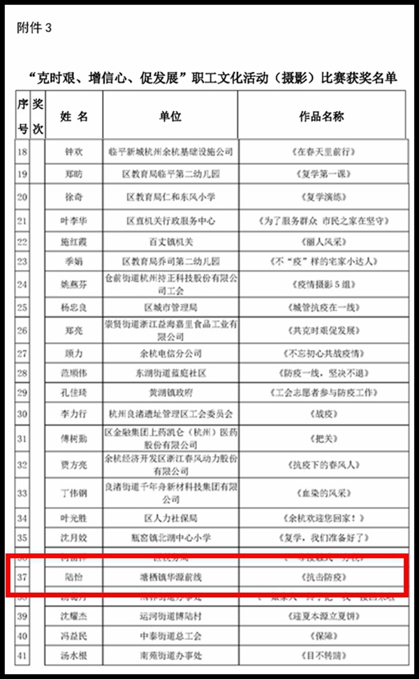 “五一”國際勞動節期間,余杭區總工會在全區開展了“克時艱、增信心、促發展”職工文化比賽活動。華源前線總經理工作部副經理陸怡代表公司投稿的攝影作品“抗擊防疫”在538組攝影作品脫穎而出,榮獲“優勝獎”。 華源前線始終以謹慎的態度面對疫情,以科學的措施防控疫情,以堅定的信心保障生產,以飽滿的熱情不懈奮斗!