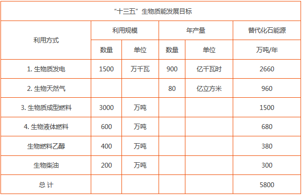 國家能源局印發的《生物質能發展“十三五”規劃》指出,到2020年,生物質能產業新增投資約1960億元。其中,生物質發電新增投資約400億元,生物天然氣新增投資約1200億元,生物質成型燃料供熱產業新增投資約180億元,生物液體燃料新增投資約180億元。“十三五”期間,生物質重點產業將實現規模化發展,成為帶動新型城鎮化建設、農村經濟發展的新型產業。預計到2020年,生物質能產業年銷售收入約1200億元,提供就業崗位400萬個,農民收入增加200億元,經濟和社會效益明顯。2020年,生物質能基本實現商業化和規模化利用。生物質能年利用量約5800萬噸標準煤。生物質發電總裝機容量達到1500萬千瓦,年發電量900億千瓦時,其中農林生物質直燃發電700萬千瓦,城鎮生活垃圾焚燒發電750萬千瓦,沼氣發電50萬千瓦;生物天然氣年利用量80億立方米;生物液體燃料年利用量600萬噸;生物質成型燃料年利用量3000萬噸。