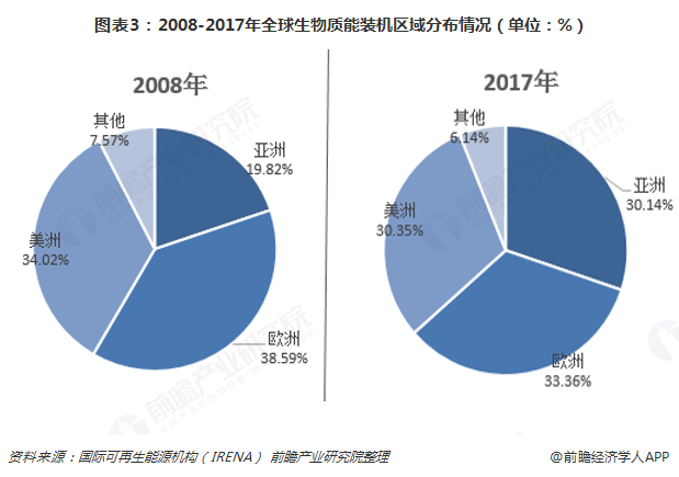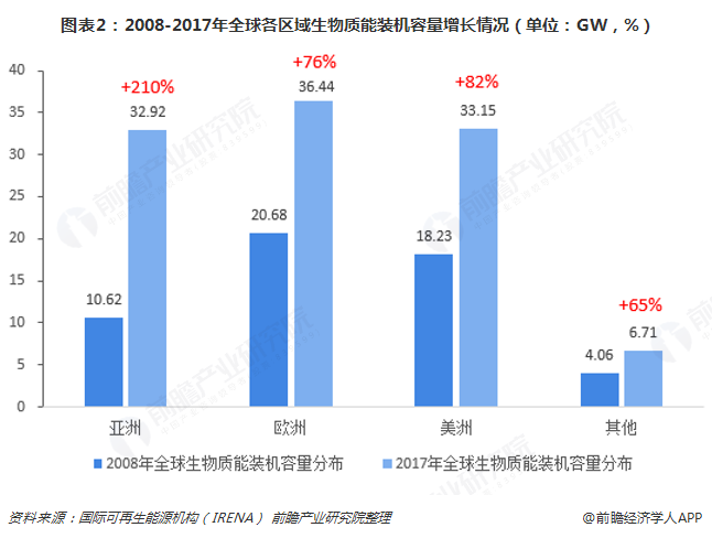 盡管從2008年到2017年歐洲和美洲仍然是全球生物質(zhì)能裝機第一、第二大市場,但二大市場全球占比卻均有所下降,分別較2007年下降了5.23個百分點和3.67個百分點。亞洲則相反,全球占比十年間上升了10.32個百分點。增速方面,2008-2018年亞洲全球生物質(zhì)能裝機增長了210%,遠超歐洲的76%以及美洲的82%,亞洲成全球生物質(zhì)能裝機容量持續(xù)穩(wěn)定增長的主要推動力。