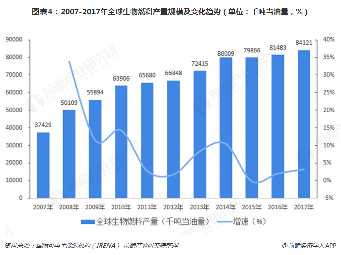 隨著全球大規(guī)模、大范圍的發(fā)展生物質(zhì)能發(fā)電,生物燃料生物燃料產(chǎn)量規(guī)模也實現(xiàn)的迅速的增長。數(shù)據(jù)顯示,2007年全球生物燃料產(chǎn)量為3742.9萬噸當油量,至2017年上升至8412.1萬噸當油量,2008-2017年復合增長率達8.43%。