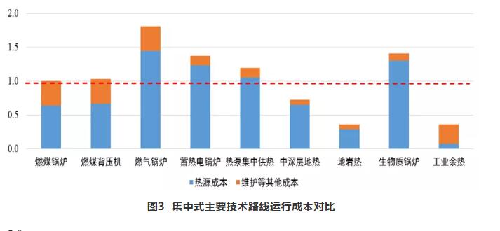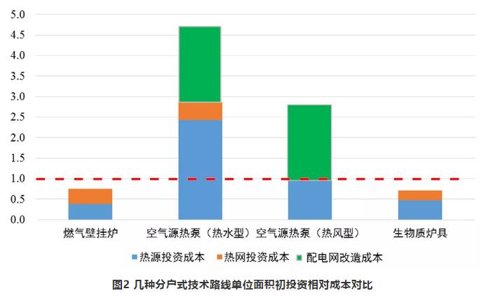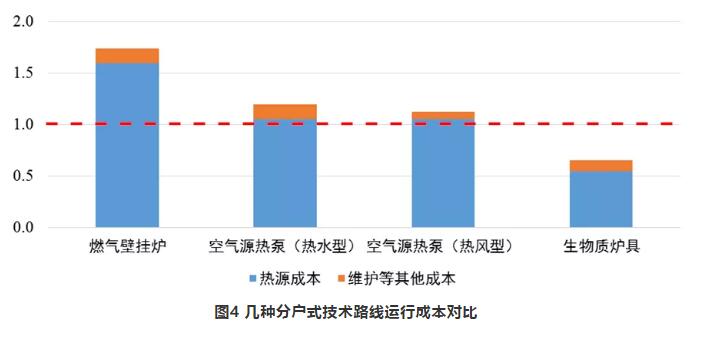 分散供暖方式中,分戶式生物質(zhì)供暖運行成本最低,僅是燃煤鍋爐的0.7倍,熱泵供暖與燃煤鍋爐相當(dāng),壁掛爐供暖運行成本是燃煤鍋爐的1.5~2.0倍。