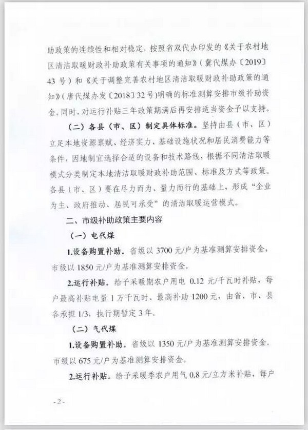 根據《河北省2019年采暖季潔凈煤取暖工作實施方案》,按照省財政廳下達唐山農村地區專項資金口徑和市政府批準市發改委提供的建成區各縣(市、區)區使用潔凈煤戶數、配套爐具數,市級予以補助。市級標準:對潔凈煤按200元/噸,型煤配套爐具按200元/套,按上述口徑,對于省補助標準缺口部分,區補助50%,市、縣不予補助。